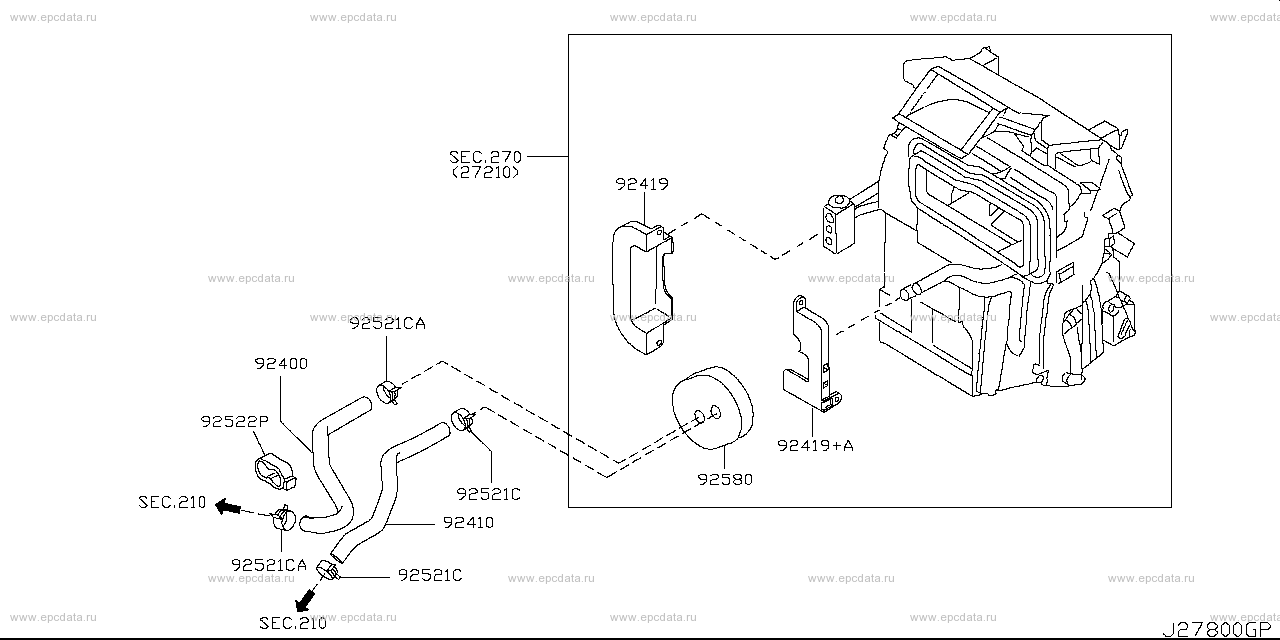 ![]() | 92400 - hose, heater inlet 92410 - hose, heater outlet 92419 - cover, heater hose 92419+A - cover, heater hose 92521C - clip 92521CA - clip 92522P - clip 92580 - grommet |